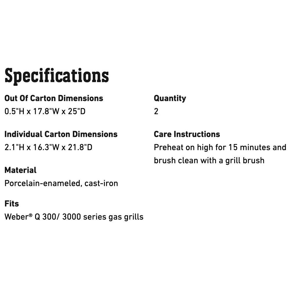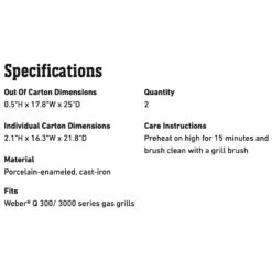 Weber Grates for Q 300/3000 Series Grills (WEB-7646) provides a perfect replacement for your Weber grill. This set of two porcelain-enameled cast iron grates provides even heating for great grill marks every time.