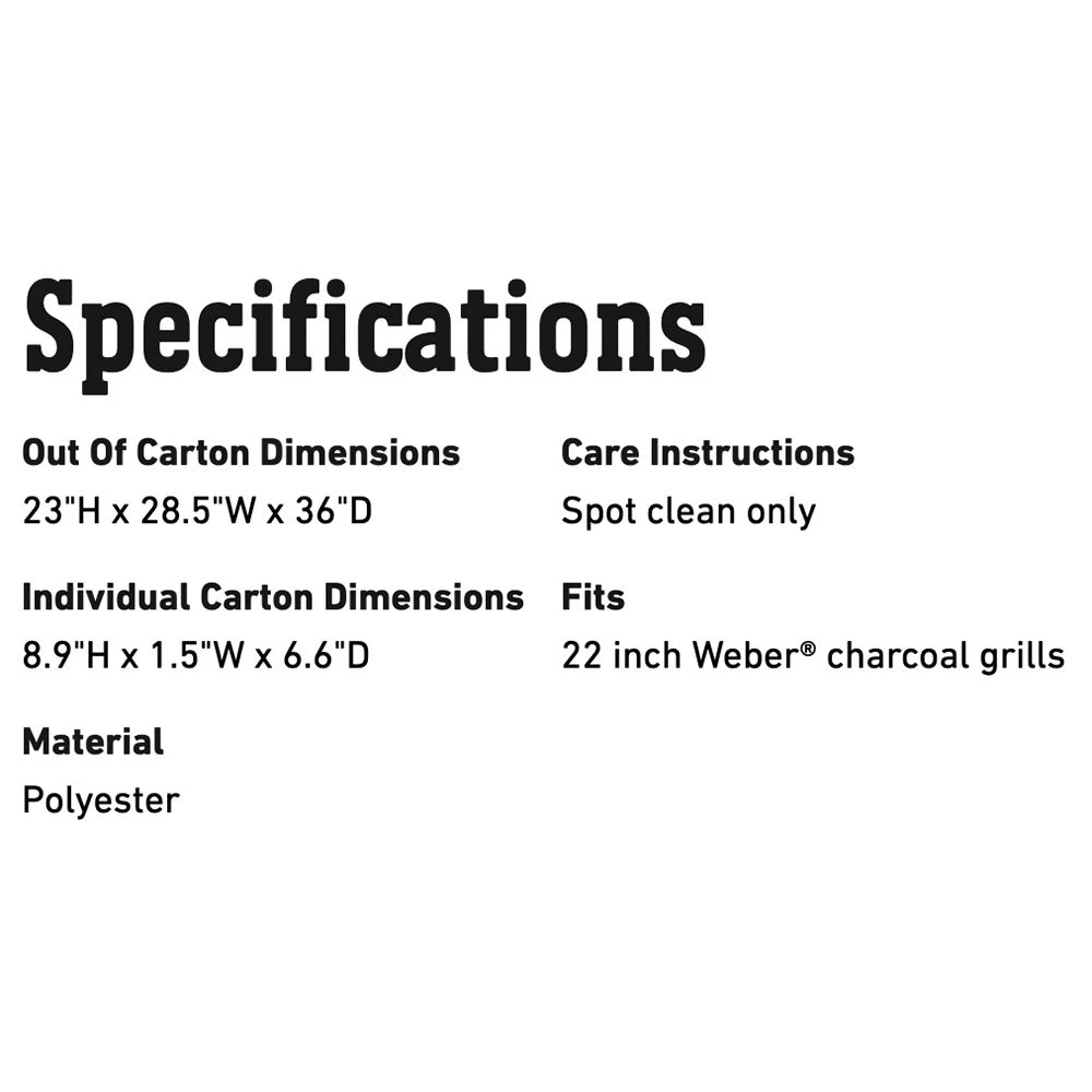 Weber Grill Cover for 22-Inch Charcoal Grills (WEB-7176) offers an excellent way to protect your Weber grill from the elements. Weather-resistant fabric helps shield your grill from rain and snow, while the smart fastening straps ensure the grill cover stays in place for lasting protection.
