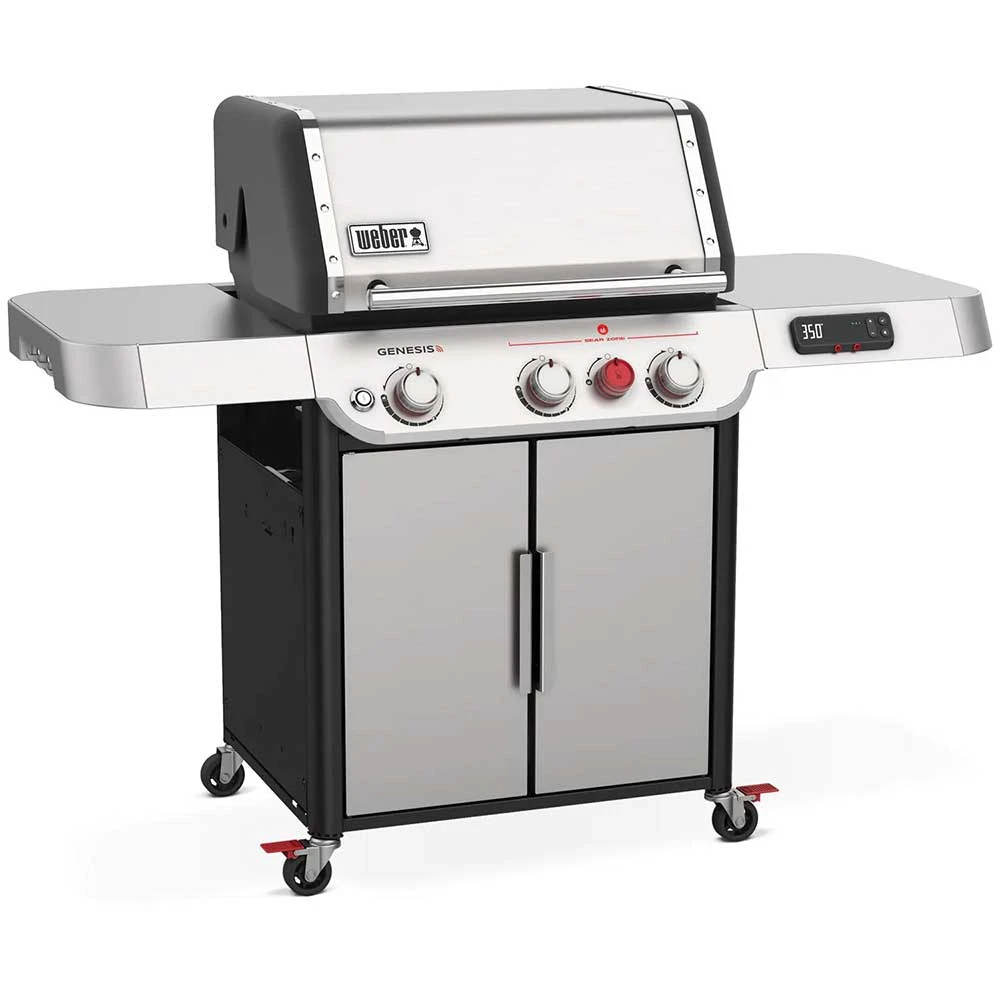 While smart grilling is a huge plus, the new Weber Genesis SX-325s propane grill in stainless steel has much more to offer in terms of pure cooking power. It all starts with the largest and hottest sear zone Weber has ever brought to market, enabling you to perfectly caramelize steaks for the whole party at once. The 3 main burners, meanwhile, have a proprietary, ported design that combines high efficiency and precise heat with reliable ignition. You get to make those powerful burners go even further with a top cooking grate that folds out to vastly increase grilling space, allowing you to make meals in one shot. Handing out (and preparing) those meals is easier with the extra-large prep & serve table, which has room for multiple serving trays or cutting boards. And as for cleaning, the grease management system has a revamped design, with the drip pan now attached to the grease tray to speed along cleanup using the included scraper.
