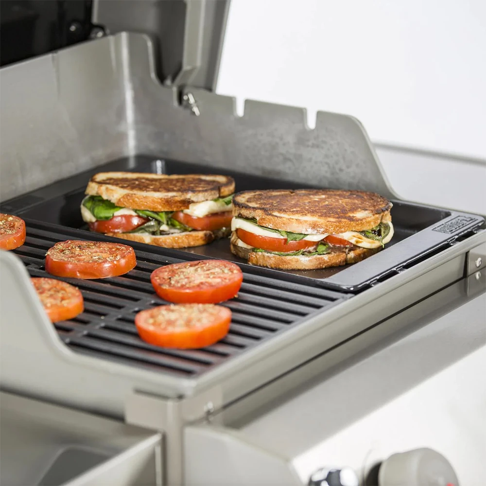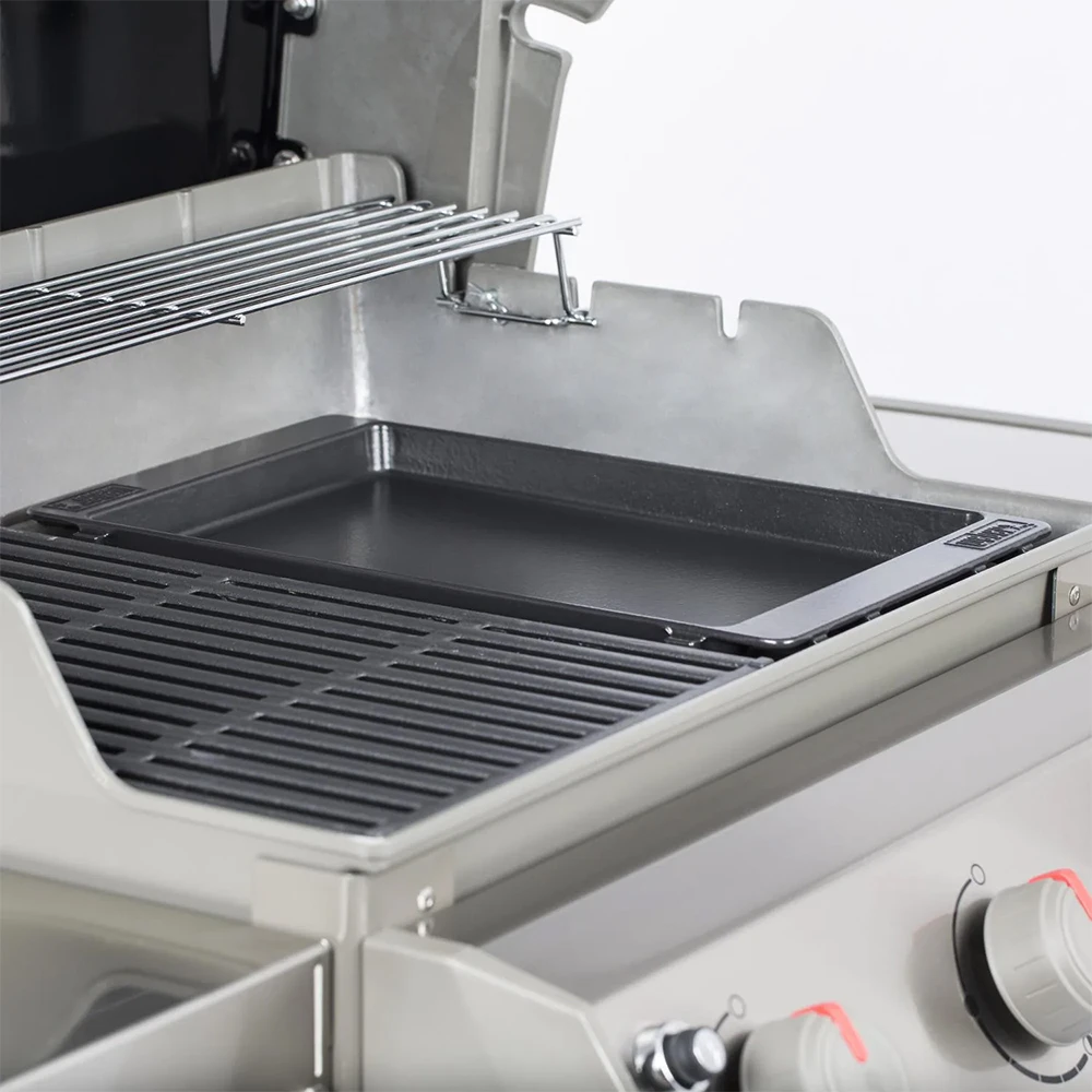 This sturdy, porcelain-enamel coated cast-iron griddle will expand your grilled menu options, with no seasoning of the grate required! Nothing beats pancakes or french toast on the grill. This griddle is also perfect for grilling food that typically would fall through the grates like scallops, asparagus, and zucchini. The angled cooking surface lets grease drain into the convenient reservoir for easy cleanup. This griddle fits Weber Spirit II 200/300 and Spirit 200/300 series gas grills