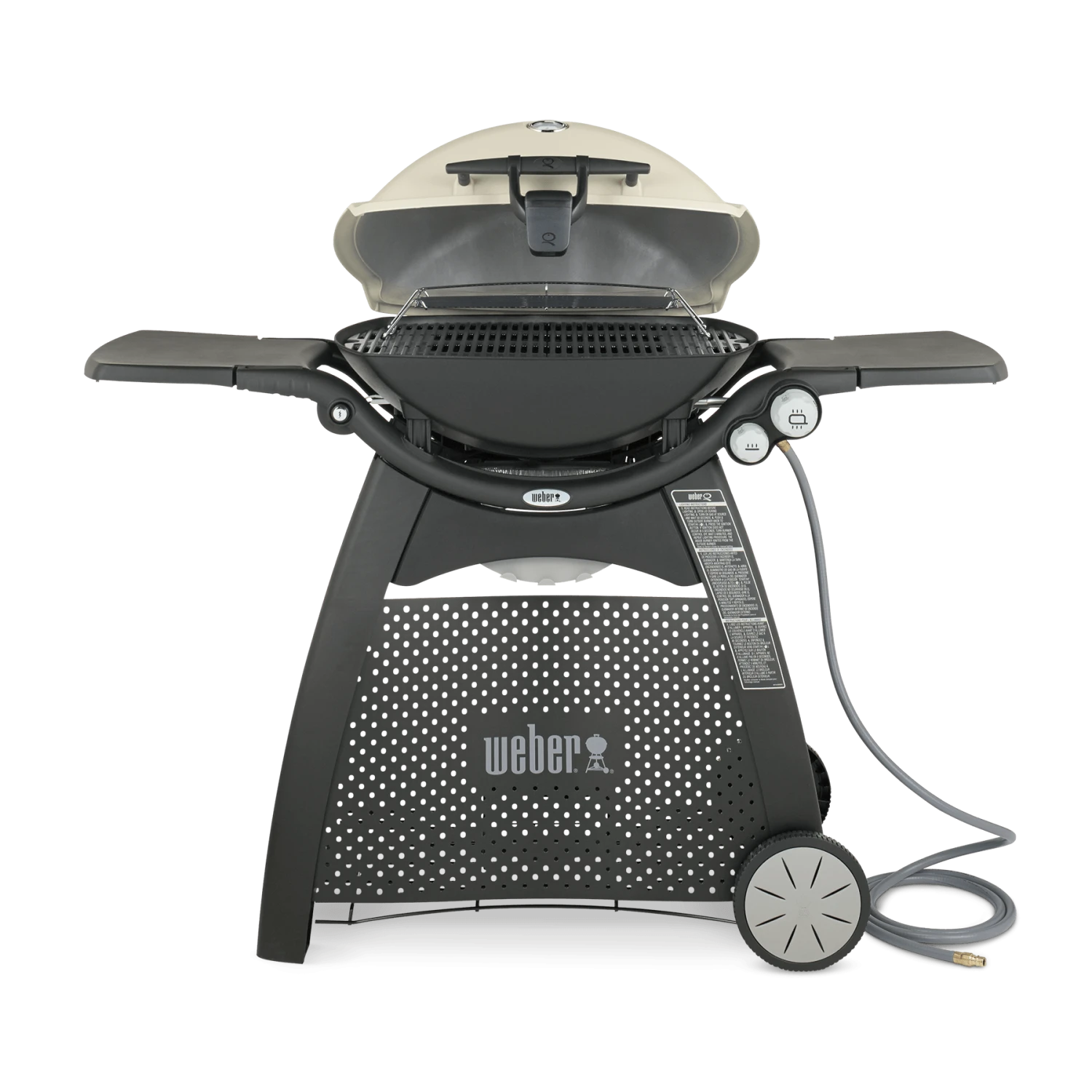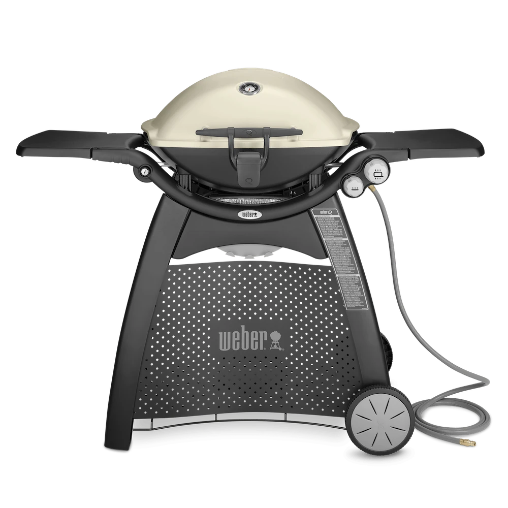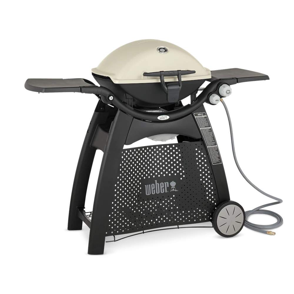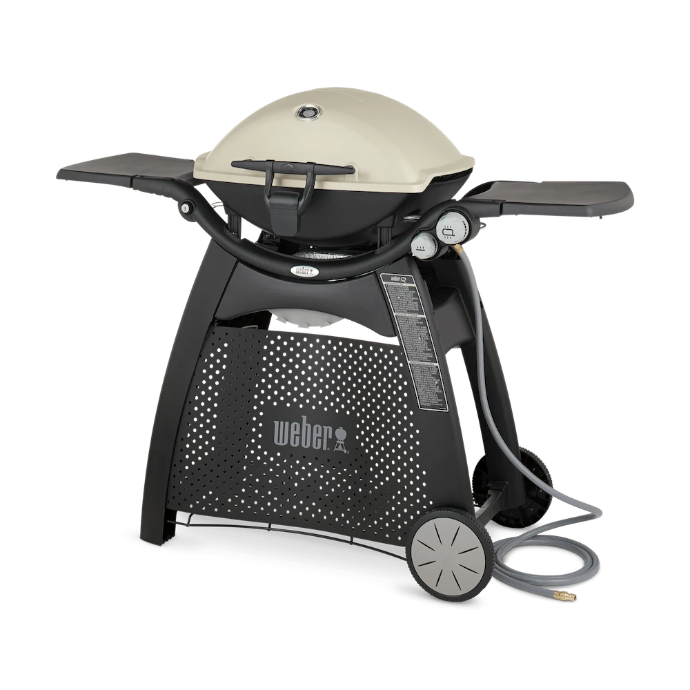 Stand up and stand out with a Weber Q 3200 BBQ grill! Compact Weber Q gas grills are perfect for tailgating or small spaces like apartment balconies. This larger version of the popular Weber Q gas grill offers 462 square inches of total cooking space, including 69 square inches on a warming rack. With the push of a button, the grill lights the two durable stainless steel burners to produce an amazing 21,700 BTUs. The infinite control burner valves allow you to set the precise temperature you need with easy-to-use knobs. This Weber natural gas grill has a tall cast aluminum lid for larger items and has a built-in thermometer to monitor the cooking temperatures. The sturdy cart features two removable folding work tables, each with convenient tool hooks, so you have space to spread out and work and comes with a grill-out handle light so you can grill at night. The Weber Q 3200 also features two large capacity porcelain-enameled cast-iron cooking grates, a cast aluminum body with drip ducts, and a sturdy glass-reinforced nylon frame and handle. This Weber Q includes a removable grease catch pan for easy cleaning and a 10-foot quick-disconnect flexible natural gas hose. The Weber Q recipe booklet is also included.