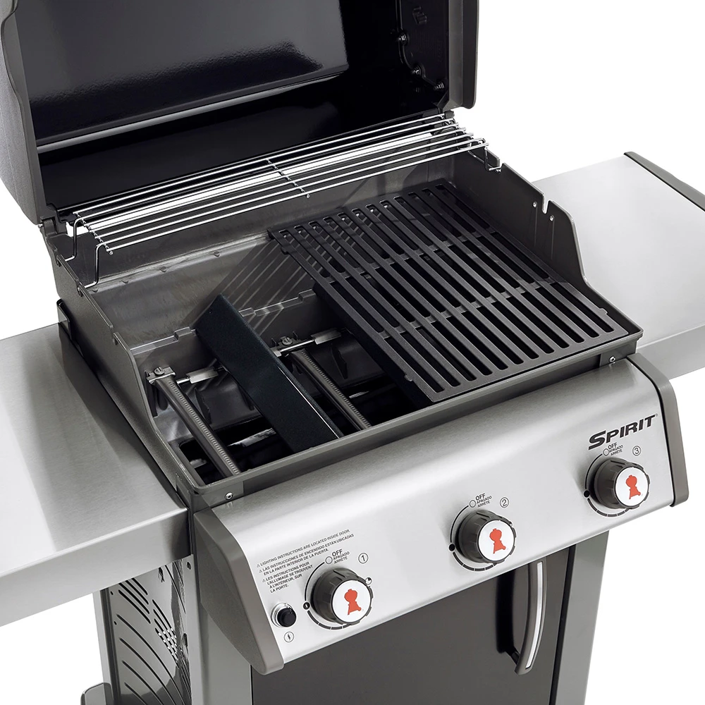 The porcelain-enameled Weber Spirit E-310 features 3 stainless steel burners that produce 32,000 BTUs, each with independent electronic ignition. The Spirit E series propane gas grill boasts porcelain-enameled cast-iron cooking grates and porcelain-enameled Flavorizer bars to effectively hold and distribute heat evenly over the 424 square-inch main cooking surface. The warming rack provides an additional 105 square inches for a total of 529 square inches of cooking area. Spirit grills come equipped with a porcelain-enameled grease tray with a catch pan to make clean-up as easy as possible. The black porcelain-enameled hood has a center-mounted thermometer to monitor cooking temperatures and painted cast-aluminum end caps. This Weber Spirit grill has a painted steel frame and front-mounted control knobs to leave more room on the two stainless steel side shelves for prep space. The grill cart features painted steel doors, stainless steel handles, painted side and rear panels, and four heavy-duty casters (2 lockings and 2 swivels). The enclosed tank storage area keeps your propane tank out of sight and the precision fuel gauge lets you know exactly where you stand on fuel at all times. Six convenient built-in tool hooks keep your BBQ tools nearby. All these features are what make the affordable Weber Spirit E-310 perfect for cooking small, everyday meals in your own backyard.