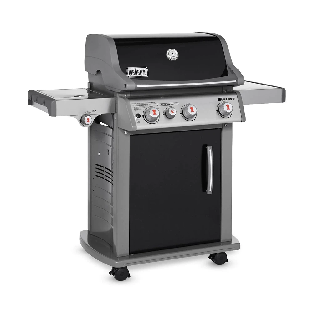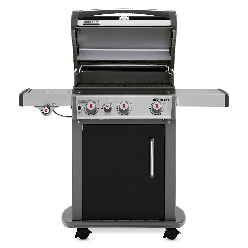 The porcelain-enameled Weber Spirit E-330 features 3 stainless steel burners that produce 32,000 BTUs and a 7,500 BTU Sear Station, each with independent electronic ignition. The specially designed searing area allows you to sear like a professional for restaurant-quality steaks, without taking away traditional grill space. The Spirit E series propane gas grill boasts porcelain-enameled cast-iron cooking grates and porcelain-enameled Flavorizer bars to effectively hold and distribute heat evenly over the 424 square-inch main cooking grid. The warming rack provides an additional 105 square inches for a total of 529 square inches of cooking area. Spirit grills come equipped with a porcelain-enameled grease tray with a catch pan to make clean-up as easy as possible. This Weber Spirit E-330 also has a 12,000 BTU flush-mounted side burner that lets you multi-task while grilling by cooking side dishes and warming sauces right next to the grill. The black porcelain-enameled hood has a center-mounted thermometer to monitor cooking temperatures and painted cast-aluminum end caps. This Weber Spirit grill has a painted steel frame and front-mounted control knobs to leave more room on the two stainless steel side shelves for prep space. The grill cart features painted steel doors, stainless steel handles, painted side and rear panels and four heavy-duty casters (2 locking and 2 swivel). The enclosed tank storage area keeps your propane tank out of sight and the precision fuel gauge lets you know exactly where you stand on fuel at all times. Six convenient built-in tool hooks keep your BBQ tools nearby. All these features are what make the affordable Weber Spirit E-330 perfect for cooking small, everyday meals in your own back yard.