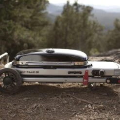 Weber Traveler Portable Propane Gas Grill with Side Table offers up a seriously innovative mobile grilling experience for camping, hiking or tailgating. The compact grill design and easy fold wheeled scissor cart make it almost effortless to take this grill anywhere and have it set up in seconds, and it folds up into a slim profile that can be fit easily in a car trunk for added convenience. It also doesn’t skimp on performance features, with a large grilling area and broad temperature range so you can achieve the same delicious results with the Traveler as you can with many full sized grills.